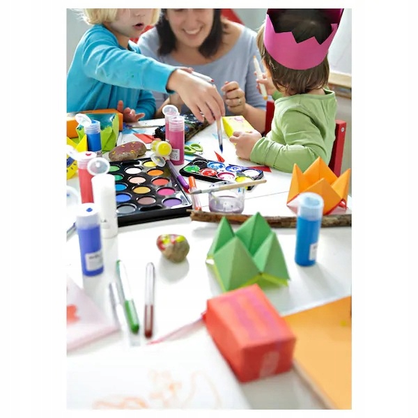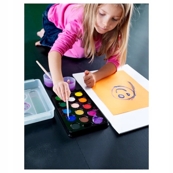 • Zawiera: 14 farb o różnych kolorach, tacka, 2 kubki na wodę i 2 pędzle