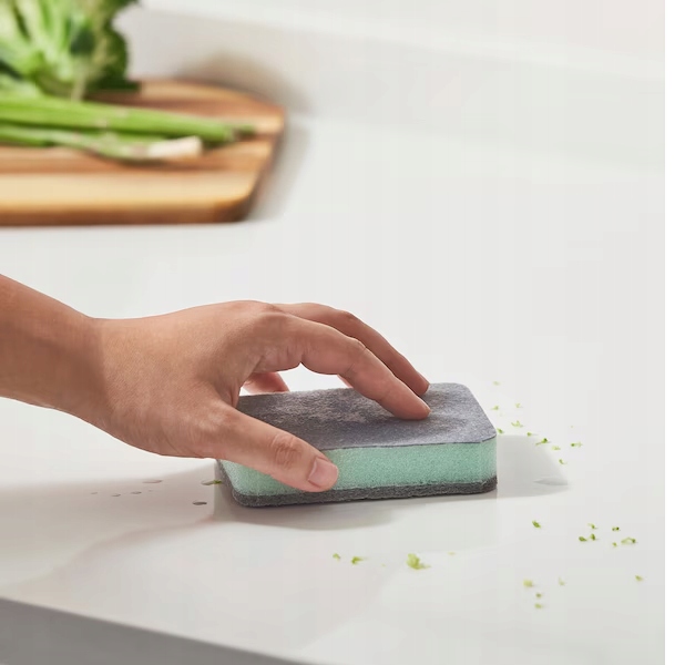 Dwie gąbki w jednej – użyj miękkiej strony do zmywania naczyń, a szorstkiej do bardziej uporczywych plam wymagających intensywniejszego czyszczenia.