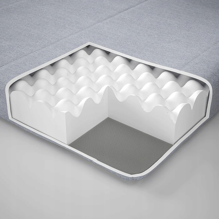 Materac AGOTNES ma pojedynczą warstwę sprężystej pianki, dzięki czemu jest wygodny. Wyściółka z pianki w pokrowcu nadaje materacowi miękkości.