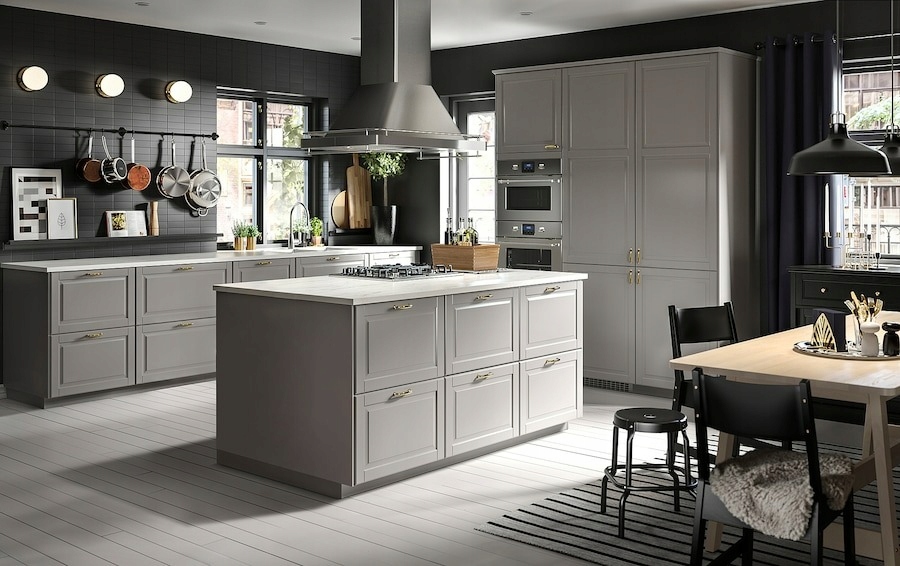 Drzwi BODBYN mają ramę i sfazowany panel, który nadaje im charakterystyczny, tradycyjny charakter. Kremowy odcień łamany bielą nadaje kuchni jasny, ciepły charakter.