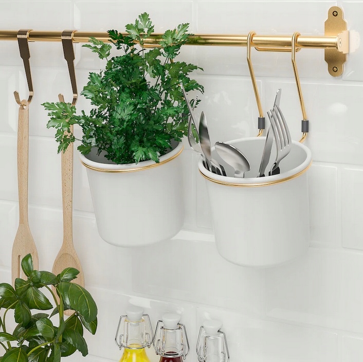 > Użyj haczyków do przechowywania naczyń kuchennych na ścianie i lepszego dopasowania ich do szafek i szuflad