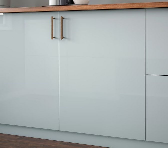 Front szuflady / front do szafki kuchennej KALLARP o numerze katalogowym 205.201.65. Wymiary: ok. 80 × 40 cm (szer. 79,7 cm × wys. 39,7 cm × grubość ok. 1,7 cm). Kolor: jasny szaro-niebieski w wysokim połysku. Fronty z tej serii są zgodne z systemem mebli kuchennych METOD.