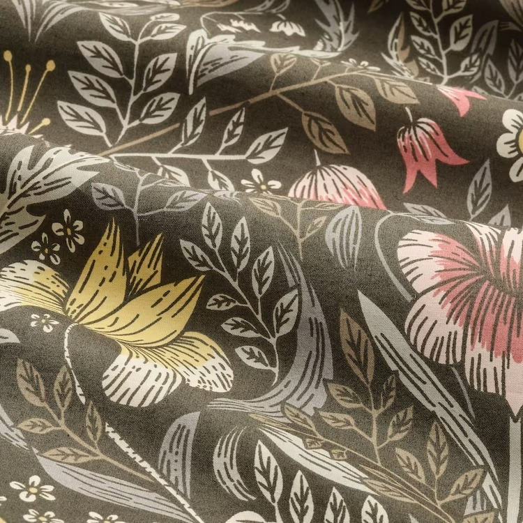 Bogaty wzór w kwiaty w kolorach ziemi inspirowany ekspresją brytyjskiego ruchu Arts and Crafts. Gęsto tkany perkal z bawełny/lyocellu o matowej powierzchni jest chłodny i szeleszczący na skórze.