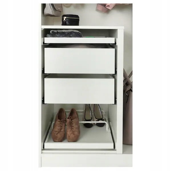 - Uzupełnij dowolnymi akcesoriami KOMPLEMENT 50×28 cm, w zależności od swoich potrzeb. Na przykład 4 szuflady lub koszyki, albo 1 wysuwany wieszak na spodnie i 1 wysuwana taca.