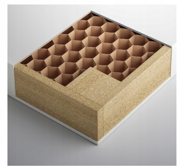 - Część górna: Płyta wiórowa, Wypełnienie z papieru o strukturze plastra miodu (100% z recyklingu), Płyta pilśniowa, Farba akrylowa, Krawędź z tworzywa