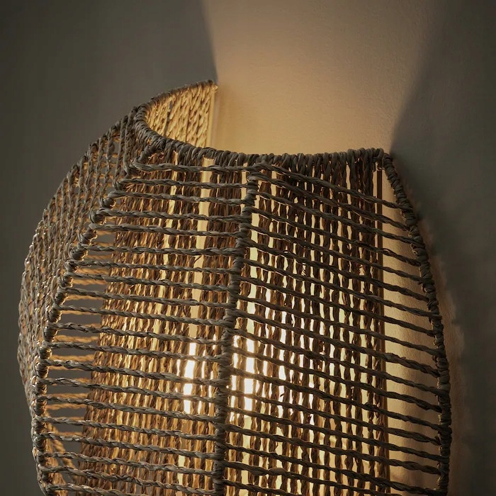 Kinkiet zapewnia przyjemne światło zarówno do góry, do dołu, jak i pomiędzy szczelinami w ręcznie plecionej turzycy.