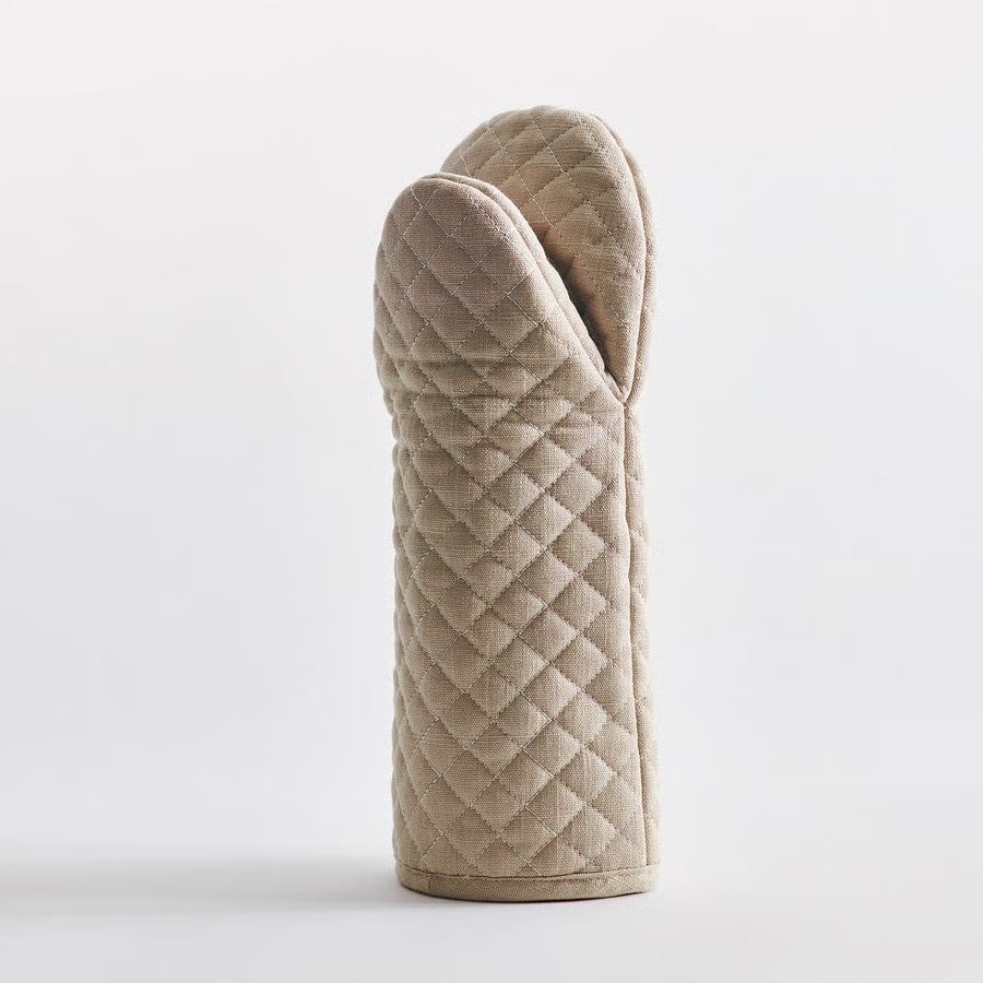 Elegancka rękawica kuchenna w ponadczasowym beżu chroni przed wysokimi temperaturami i sprawia, że gotowanie staje się bezpieczniejsze i przyjemniejsze.