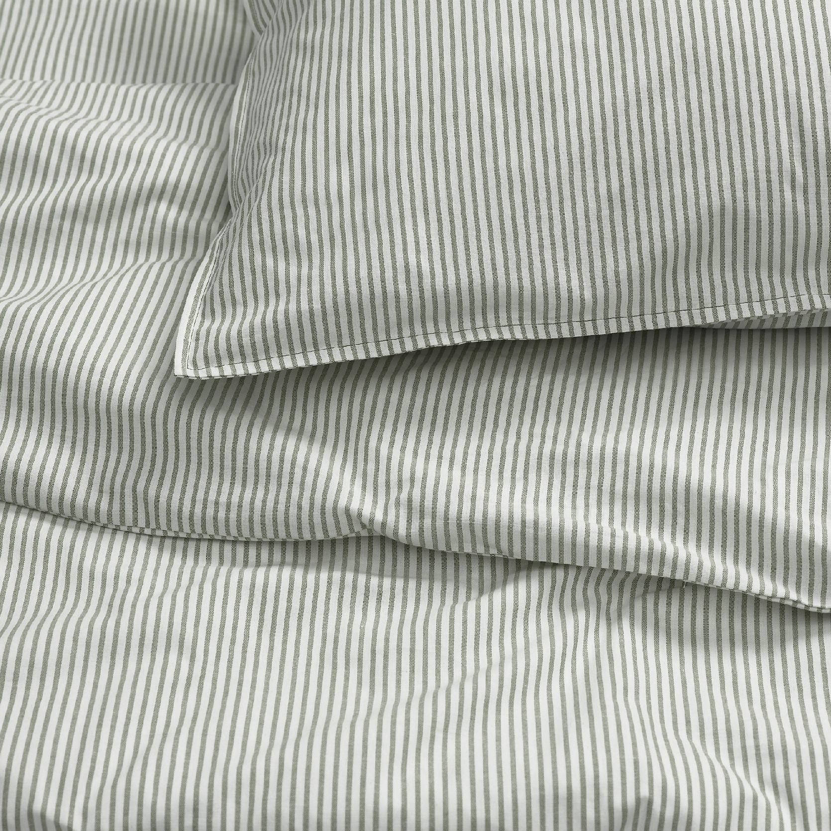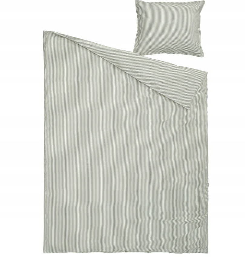 Pościel SOLFIBBLA jest wykonana z miękkiej, 100% bawełny, a barwiona przędza tworzy ponadczasowe zielono-białe pasy. Grubsza przędza tworzy w sypialni przytulną atmosferę z nutką rzemieślniczego uroku w stylu vintage.
