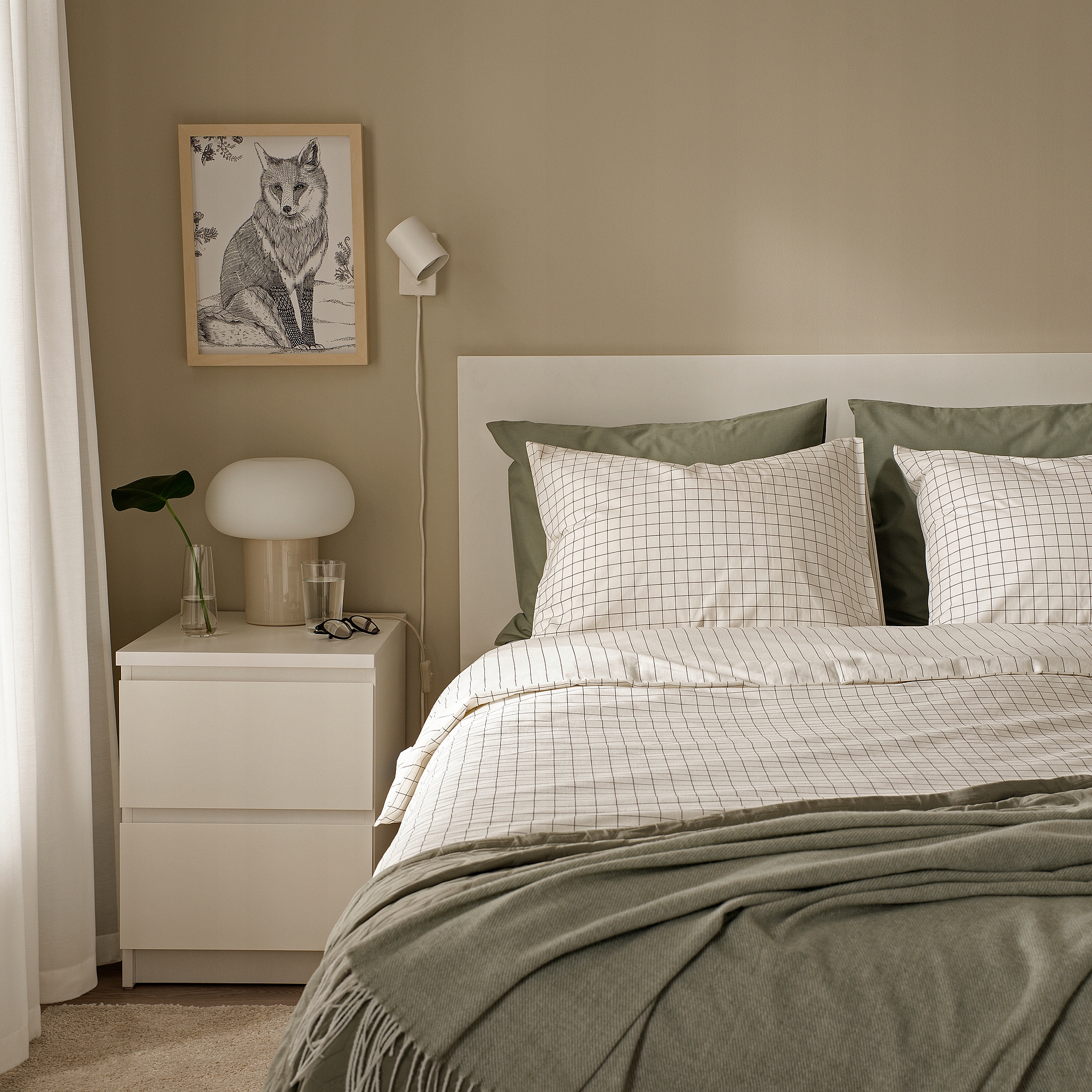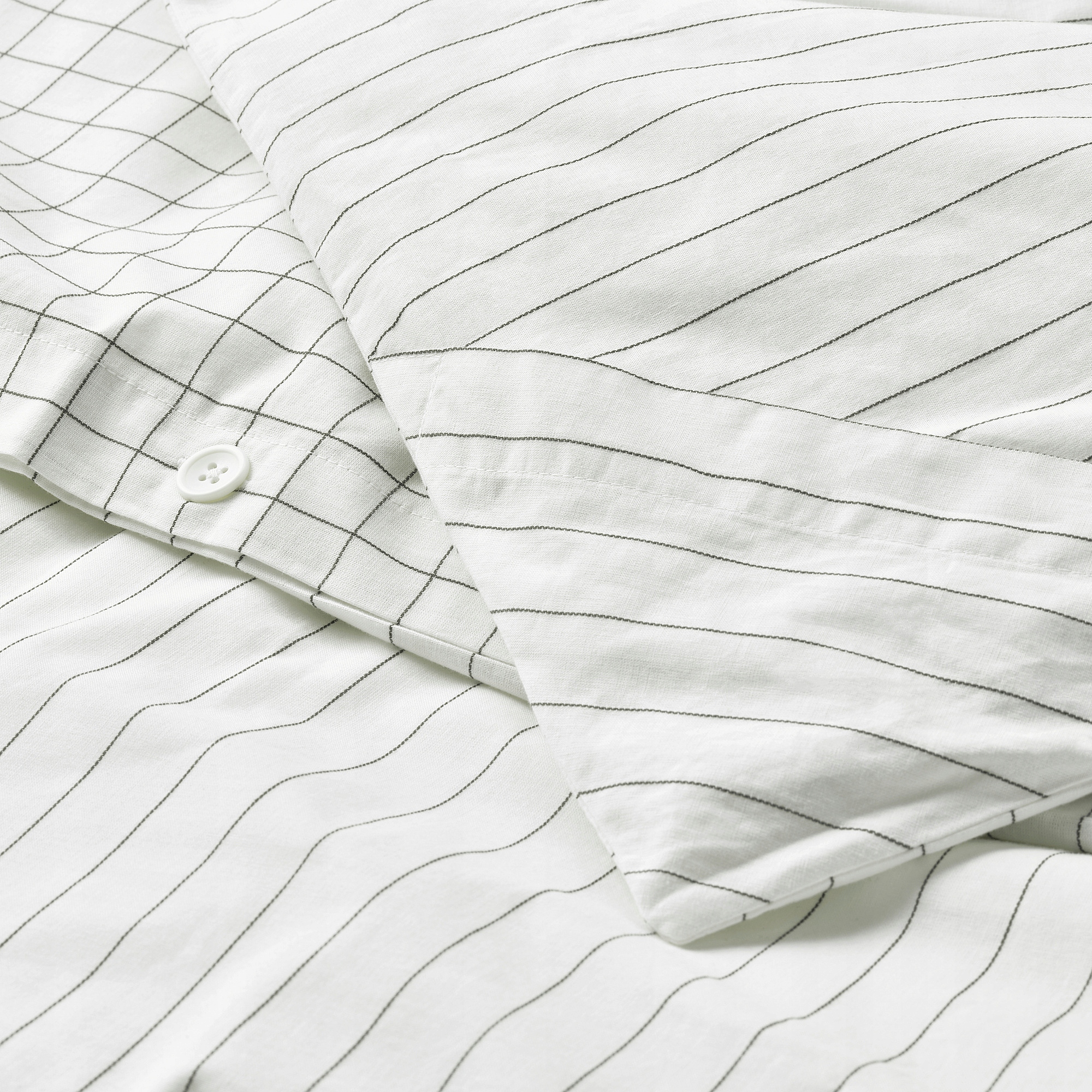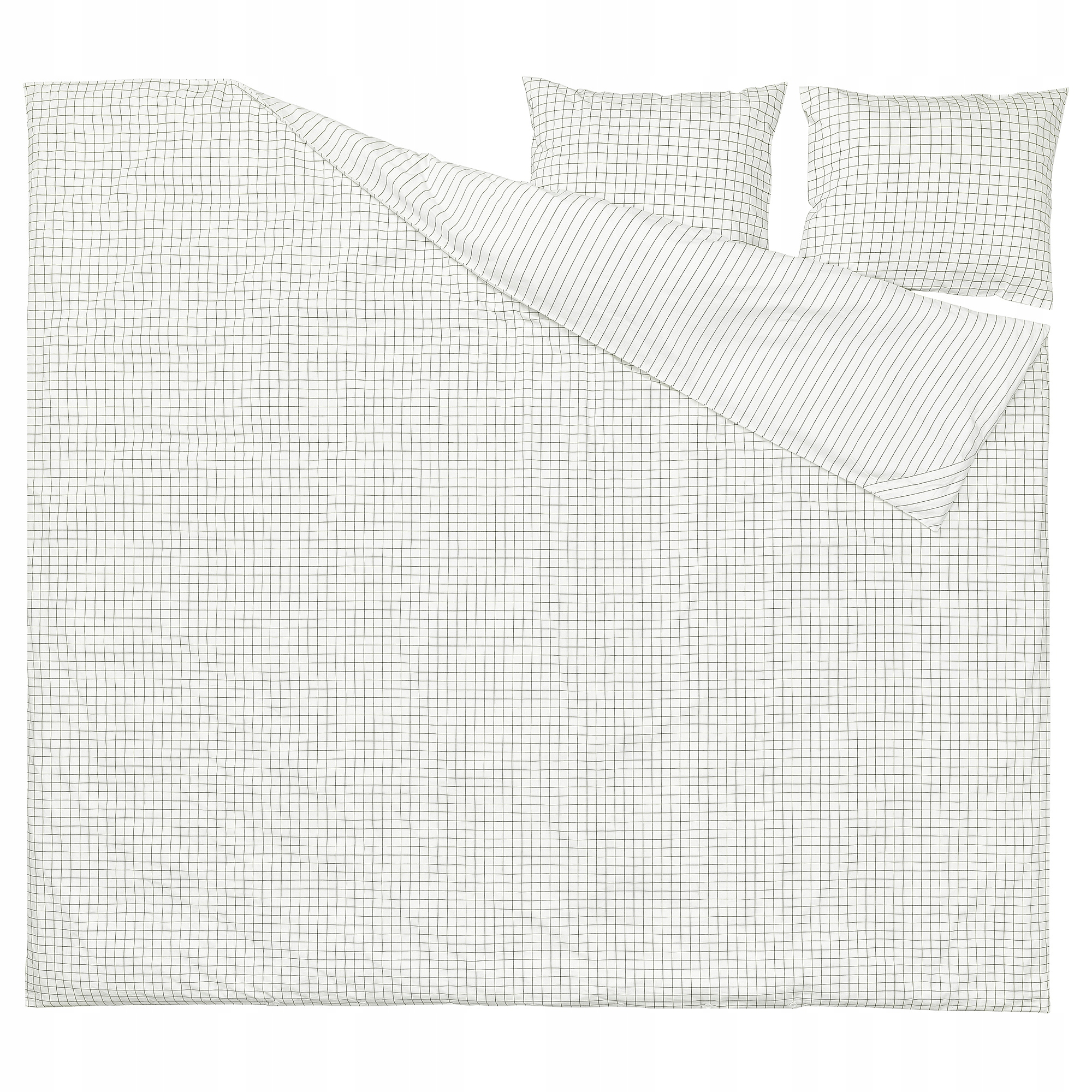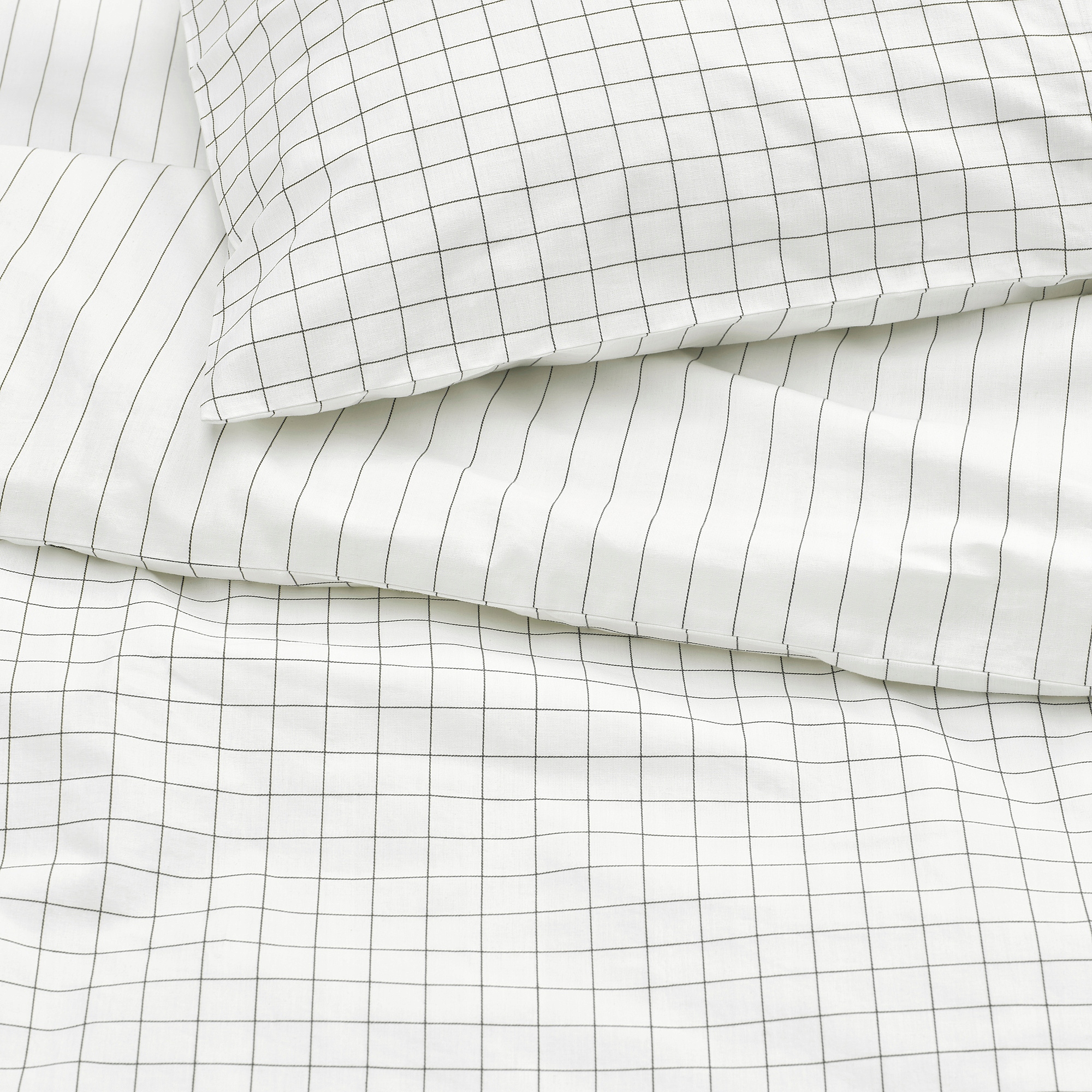 Komplet biało-antracytowej pościeli DOFTAKLEJA zdobi przeszycie w kratkę po jednej stronie i w paski po drugiej. Zakryte kieszonkami otwory w narożnikach ułatwiają wkładanie kołdry do poszwy.