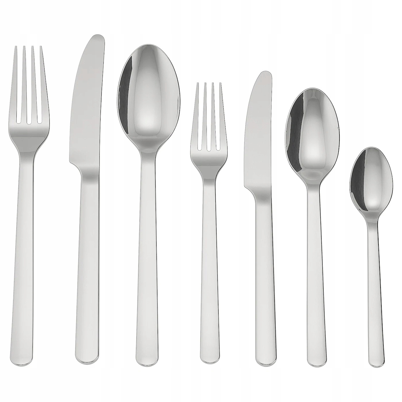 - W zestawie: widelec, nóż, łyżka, łyżeczka do herbaty, widelec do deserów/sałatek, nóż do deserów/sałatek i łyżka do deserów/sałatek, po 8 sztuk każdego.