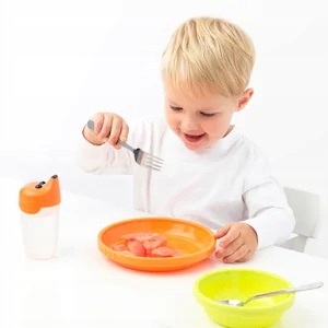 Ostrze noża ma ząbkowaną krawędź; ułatwia dziecku krojenie.