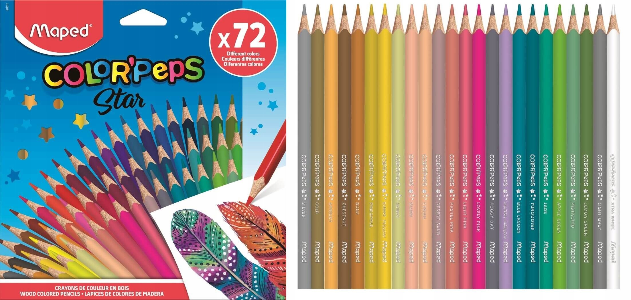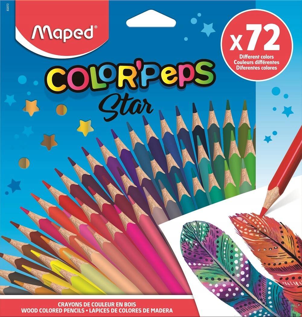 Kredki Color’Peps wykonane z drewna lipowego. Trójkątny, ergonomiczny przekrój. Intensywne kolory. Łatwe do temperowania. Grafit o przekroju 2,9 mm, odporny na kruszenia i łamanie. Wyprodukowane zgodnie z wszystkimi regulacjami dotyczącymi produktów dla dzieci. 72 różne kolory pakowane w kartonowe etui. Dekorowane opakowanie zbiorcze na 12 etui może służyć jako ekspozytor. J.S.: 1 etui.
