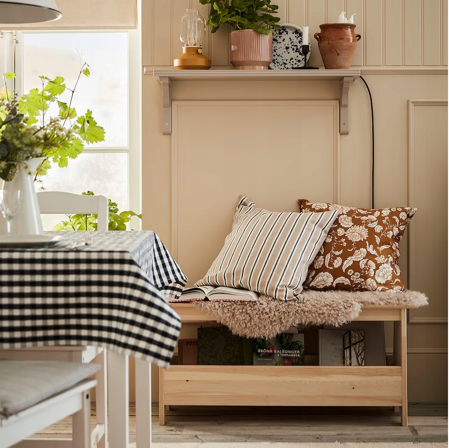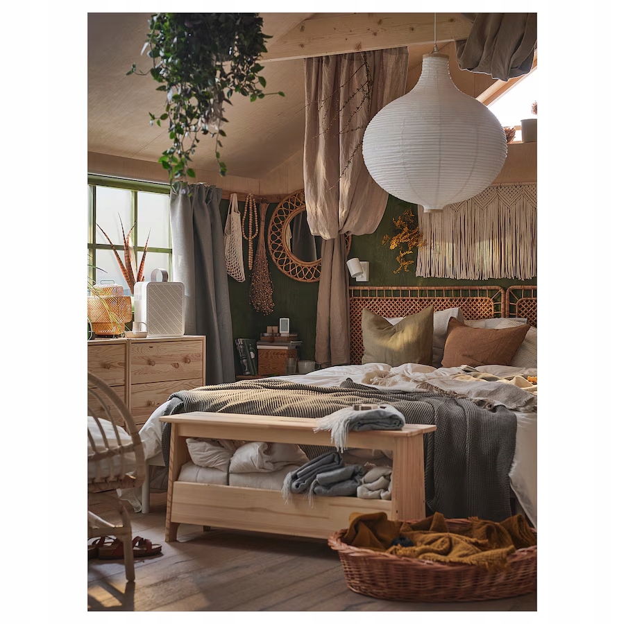 Postaw tę solidną, drewnianą ławę ze schowkiem przy stole jadalnym, w nogach łóżka, przy wejściu lub tam, gdzie potrzebujesz miejsca do siedzenia. Miejsce do przechowywania pozwala na najlepsze wykorzystanie przestrzeni. Wycięty uchwyt na górze ułatwia przesunięcie ławki tam, gdzie jej potrzebujesz. Ławkę można schować pod stołem, dzięki czemu oszczędza się miejsce. Aby uporządkować miejsce do przechowywania pod spodem, dodaj pojemnik LURPASSA z pokrywką, zestaw 2 sztuk, pojemnik KUGGIS 18x26x8 cm z pokrywką, pojemnik TJENA 18x25x15 cm z pokrywką lub organizer BAXNA 20x26x10 cm. Wykonana z sosny pozyskiwanej w sposób zrównoważony, gatunku drewna z wieloma naturalnymi cechami, różnorodnym usłojeniem i zmianami kolorów, co nadaje każdej ławie niepowtarzalny wygląd. Surowe drewno jest piękne samo w sobie, ale można je też spersonalizować nakładając jedną lub dwie warstwy farby w swoim ulubionym kolorze.