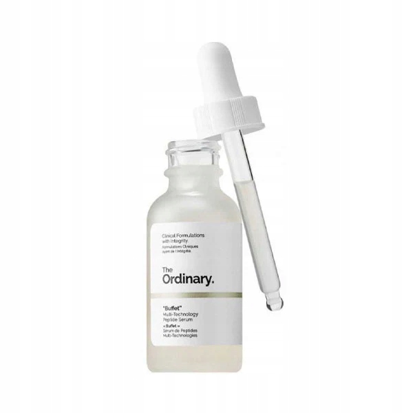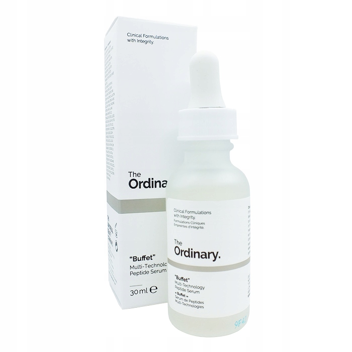 Buffet – Multi-Technology Peptide – serum przeznaczone do niwelowania pierwszych oznak starzenia się skóry. Preparat łączy w sobie kilka kompleksów peptydowych: Matrixyl 3000 kompleks peptydowy (z palmitoilo-pentapeptyd 35), Matrixyl Synthe’6 kompleks peptydów (z palmitoilo tripeptydu-38), kompleks peptydów Syn-Ake (z dipeptyd diaminobutyroyl karboksylowego dioctanu), kompleks peptydów Relistase (z acetylarginyltryptophyl diphenylglycine) kompleks peptyd Argirelox (acetylo heksapeptyd-8, pentapeptydu-18), probiotyki kompleksu (z Lactococcus lactis lizatu), w oparciu o 11 przyjaznych dla skóry aminokwasów i wielu kompleksów kwasu hialuronowego. Roztwór zawiera również NMF-natural moisturizing factor( którego nie ma wymienionego w ramowce składu, to wiem z własnej analizy). Całkowite ich stężenie to 25,1%. Preparat przyspiesza naturalne procesy naprawcze naskórka i dostarcza niezbędne składniki odżywcze w głębokie warstwy skóry.