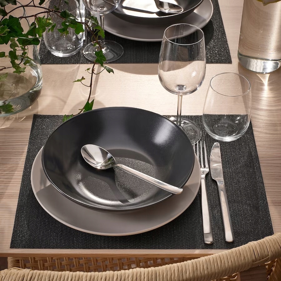 - Podkładki na stół FLYGFISK dostępne są w kilku kolorach – łącz je dowolnie albo wybierz bardziej jednolity styl. Łatwo je też utrzymać w czystości, ponieważ są wyplatane z tworzywa. Dobrym pomysłem jest połączenie ich z zastawą stołową FÄRGKLAR.
