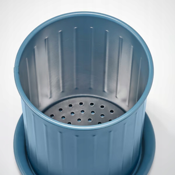 - VÄLVÅRDAD to praktyczny pojemnik na sztućce wykonany z galwanizowanej stali, wykończony w eleganckim, ciemnym szaroniebieskim kolorze. Jego prosty, cylindryczny kształt sprawia, że idealnie nadaje się do przechowywania łyżek, widelców, noży lub innych akcesoriów kuchennych. Dzięki perforowanemu dnu, sztućce mogą swobodnie wysychać po umyciu. Minimalistyczny design pasuje do każdej kuchni, a trwały materiał zapewnia odporność na wilgoć i korozję.