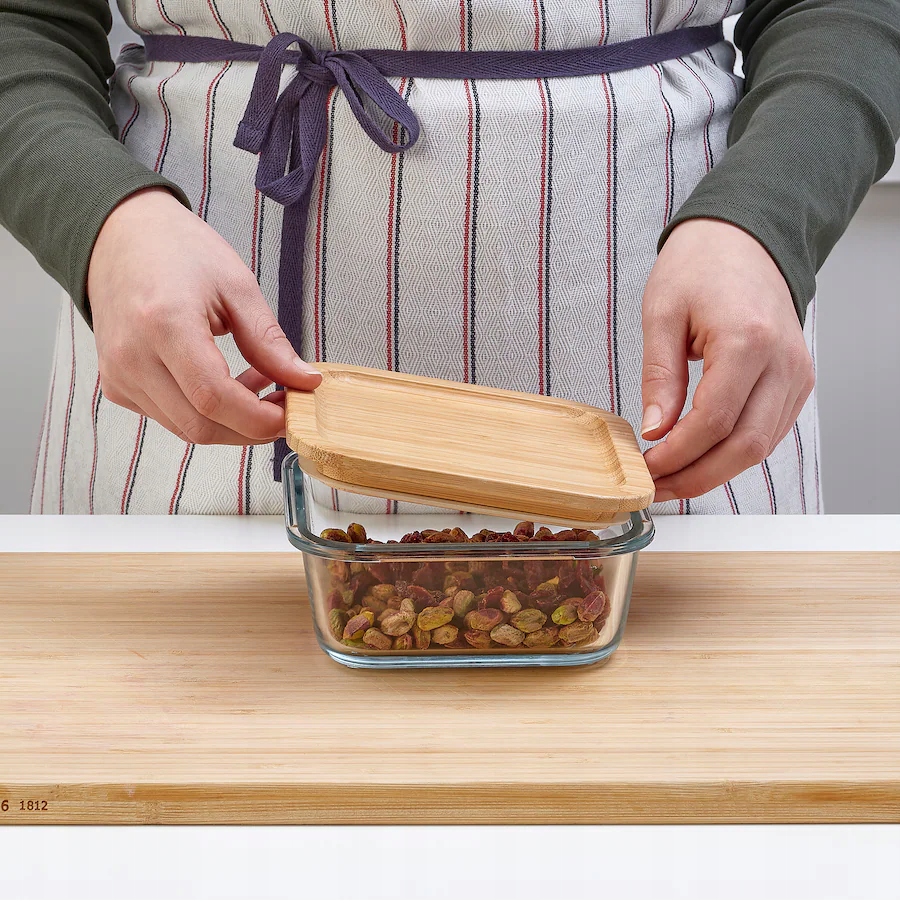 Bambusowa pokrywka wytrzymuje temperaturę do 100° C. Pojemnik można zmywać w zmywarce. Pokrywkę należy zmywać ręcznie. Pojemnik nadaje się do stosowania w piekarniku i kuchence mikrofalowej, ale nie pokrywka.