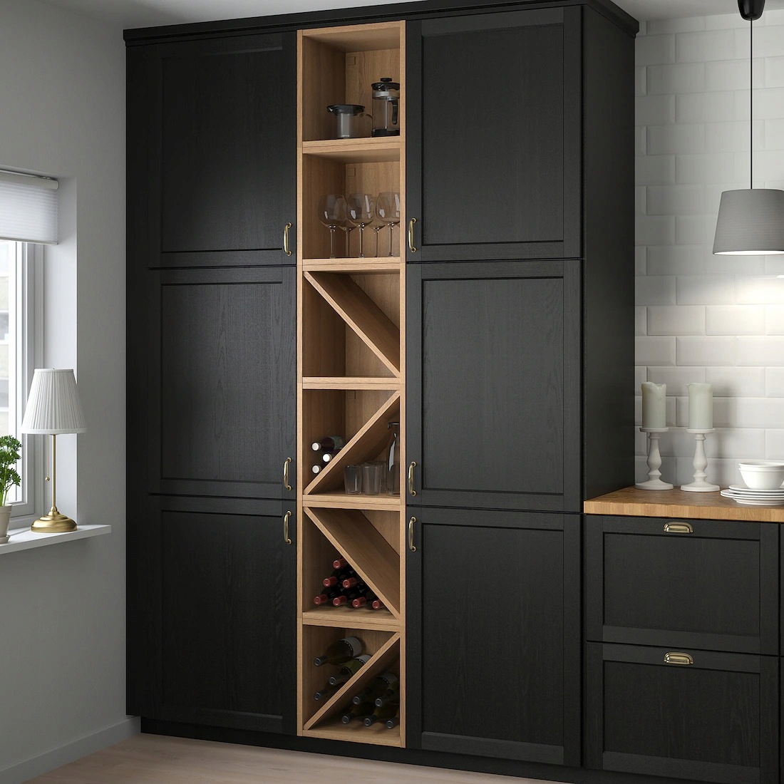 Można zamontować między dwoma szafkami lub między szafką i ścianą.