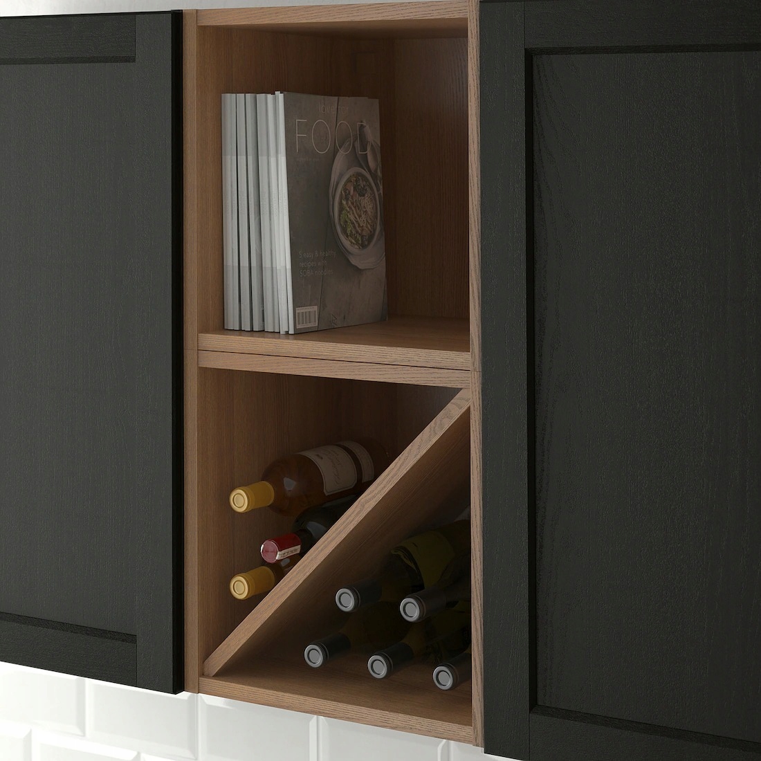 Otwarta szafka kuchenna, która nadaje się do przechowywania butelek, które dzięki temu są dobrze widoczne i łatwo dostępne.