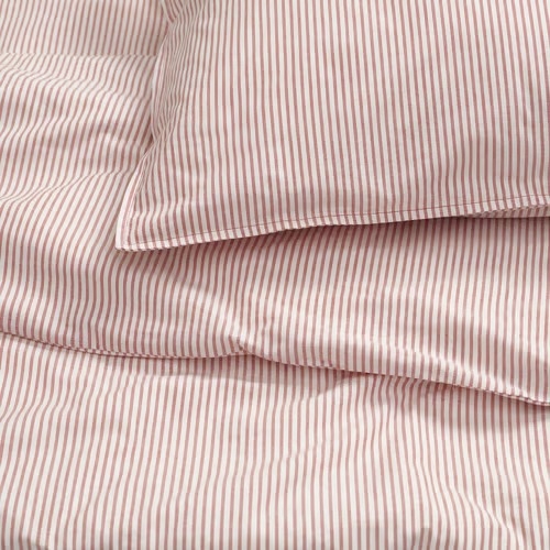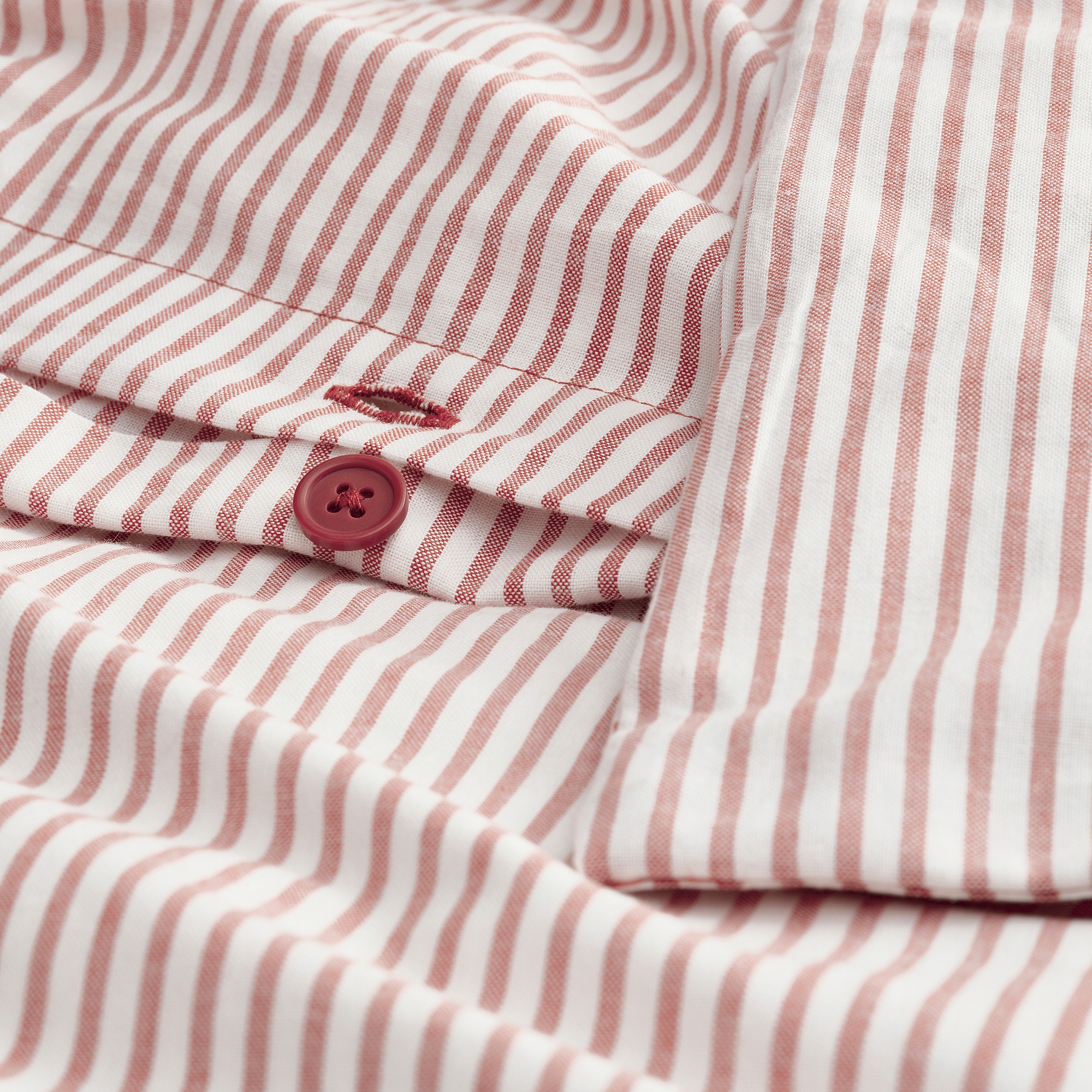 Pościel SOLFIBBLA jest wykonana z miękkiej, 100% bawełny, a barwiona przędza tworzy ponadczasowe czerwono-białe pasy. Grubsza przędza tworzy w sypialni przytulną atmosferę z nutką rzemieślniczego uroku w stylu vintage.
