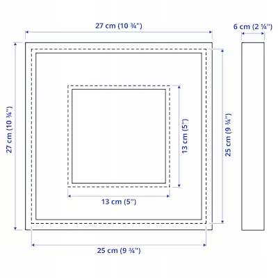 - Ta ramka pasuje do zdjęć o wymiarach 13×13 cm, jeśli używasz go z passepartout oraz do zdjęć o wymiarach 25×25 cm, jeśli zdecydujesz się użyć ramki bez passepartout.