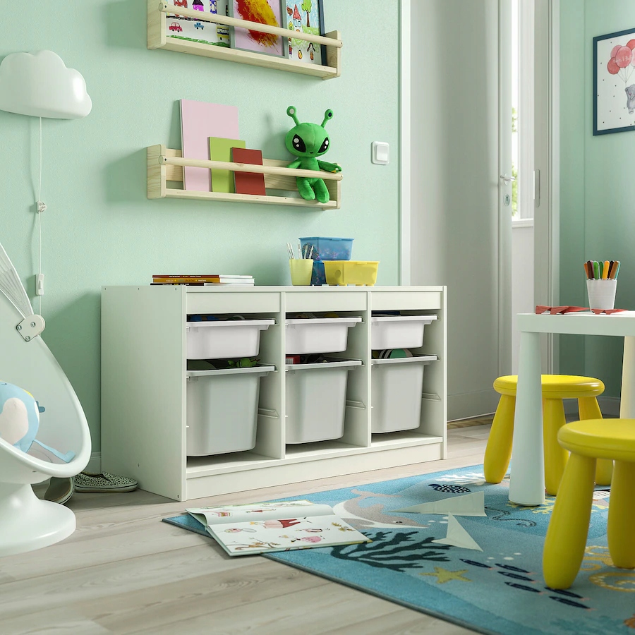 - Niski mebel z miejscem do przechowywania, dopasowany do wzrostu dziecka. Dzieciom łatwiej jest dosięgnąć i posprzątać swoje rzeczy.