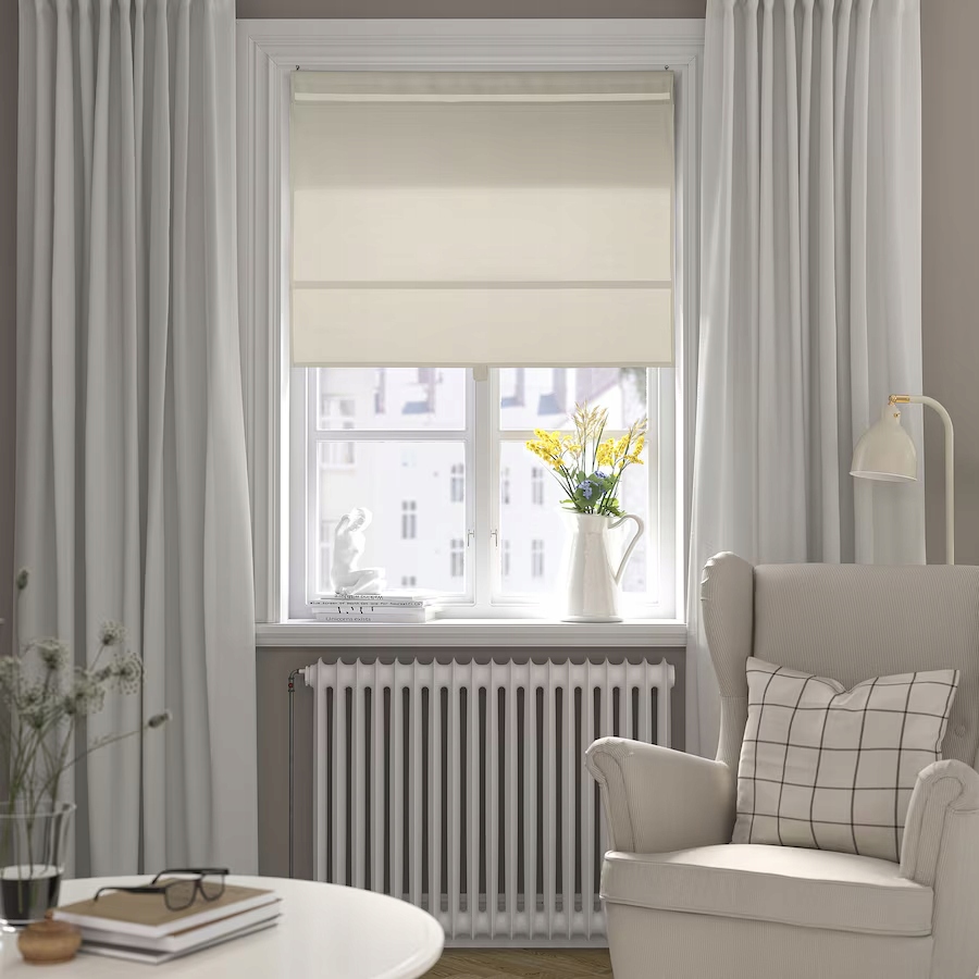 Beżowa roleta rzymska RINGBLOMMA o eleganckim wyglądzie lnu. Materiał przepuszcza światło, tworząc ciepły nastrój. Nadaje się do prania, świetnie sprawdzi się w każdym pomieszczeniu, także w kuchni i łazience. Magnetyczne podnoszenie/opuszczanie.