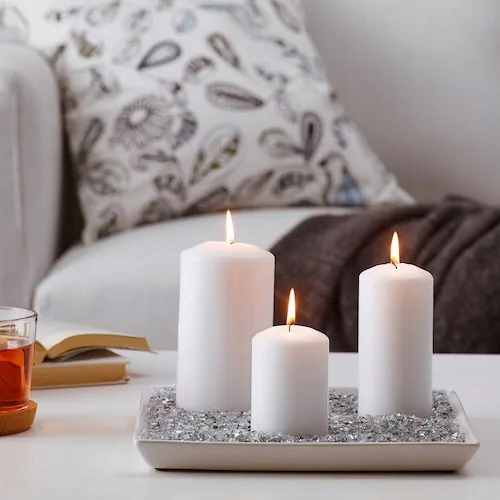 Można też wykonać piękną aranżację, łącząc na podstawce na świece tłuczone szkło ze świecami.
