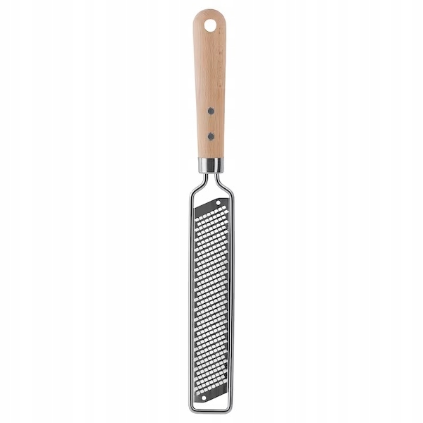 Tarka ma solidny drewniany uchwyt, który pomoże ci zetrzeć skórkę z cytrusów lub parmezan do makaronu. Po skończonym gotowaniu możesz powiesić tarkę na haczyku.