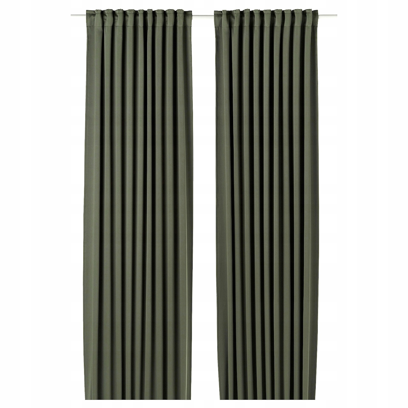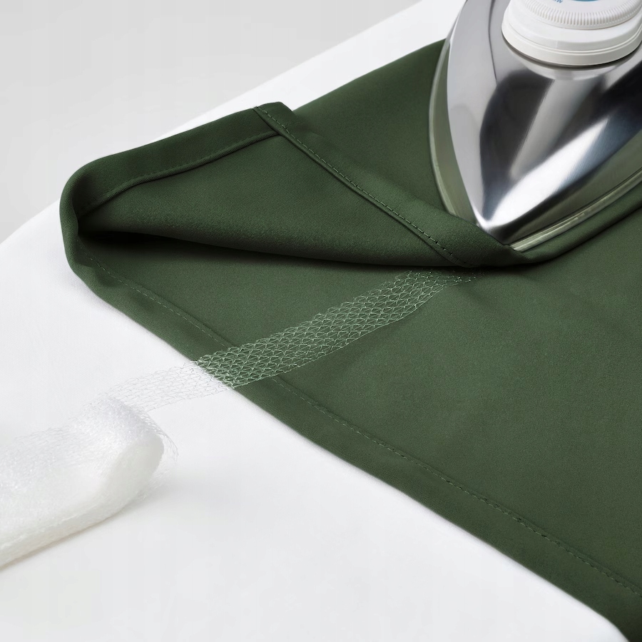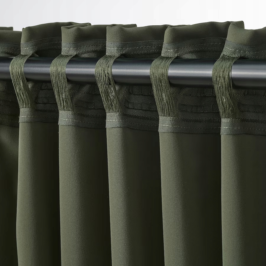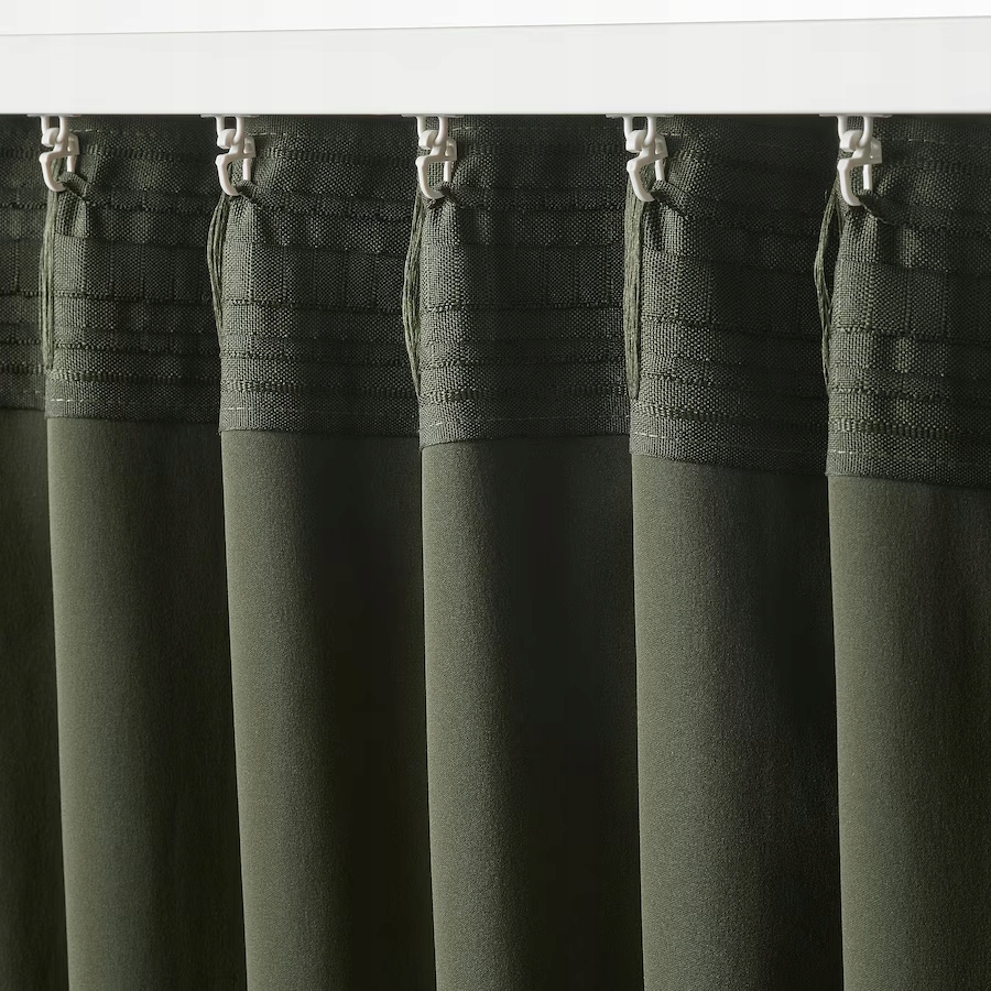 Ciemnozielone zasłony zaciemniające MAJGULL mają cudownie miękką fakturę, która wnosi do pomieszczenia ciepło i elegancję. Fałdy pięknie się układają, a tkanina zapewnia maksimum prywatności. Zasłonę można wieszać na różne sposoby.